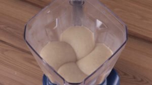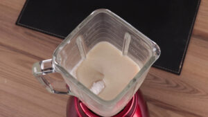 - Agora vou dividir essa mistura em 2 partes. Uma parte vou adicionar novamente no liquidificador, vou acrescentar ½ xícara de açúcar e vou bater novamente.