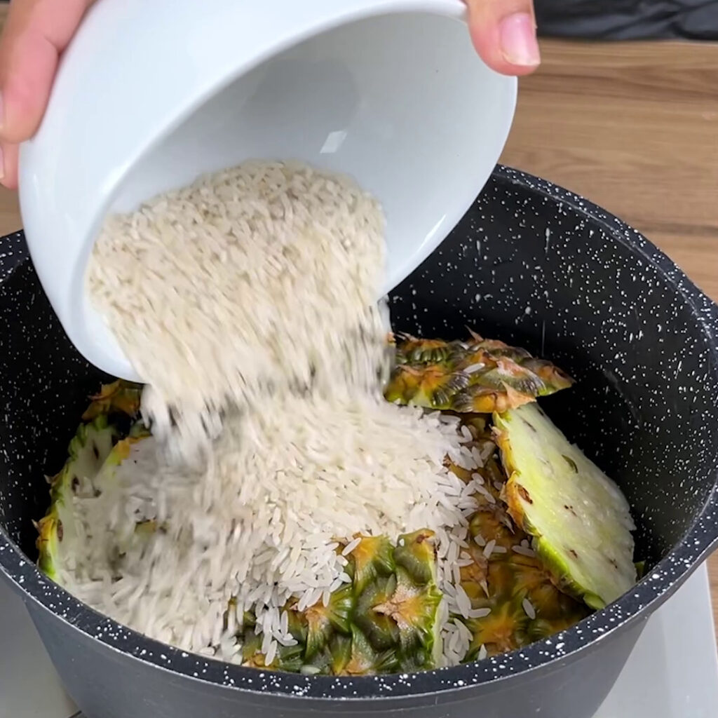 • Em uma panela, adicione as cascas de abacaxi e também o arroz.