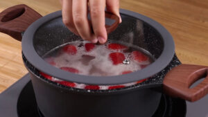 • Em uma panela em fogo alto vou adicionar 20 morangos, 1 xícara de arroz, água até cobrir, vou tampar a panela e deixar cozinhar por 20 minutos. Passado esse tempo vou desligar o fogo e retirar a panela.