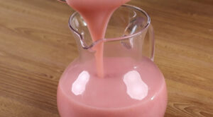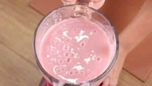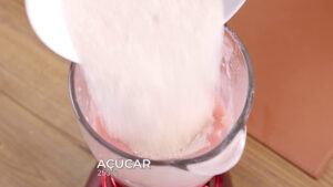 • Agora em um liquidificador vou adicionar todo o nosso arroz com morangos, irei tampar e deixar bater até que vire uma misturar homogênea.