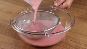 • Irei adicionar toda a nossa mistura do liquidificar dentro de uma tigela passando por uma peneira.
