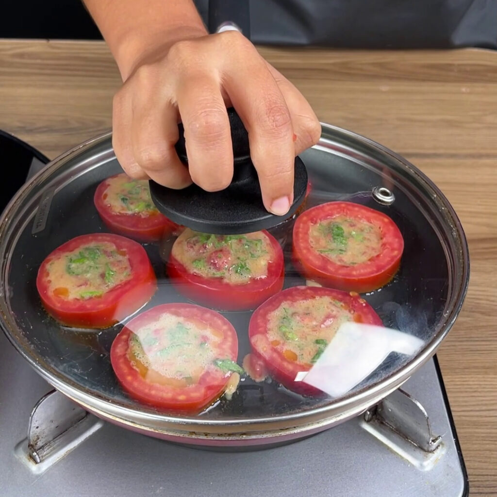 - Vou tampar nossa frigideira para cozinhar todos de forma igual, e depois de um tempo vou virar as rodelas de tomates para cozinhar o outro lado.