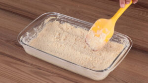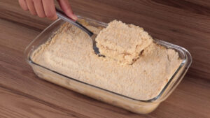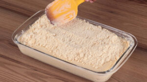 - Em seguida vou untar uma travessa com manteiga, adicionar uma parte da mistura de farinha que fizemos e vou espalhar.