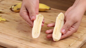 - Para a nossa receita nós vamos precisar de 2 bananas, vou descascar todas elas e cortá-las ao meio.