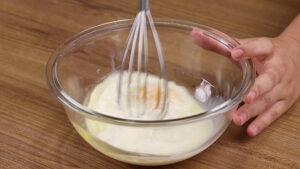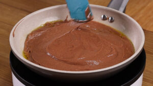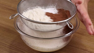 - Vou adicionar agora passando por uma peneira 130 g de farinha de trigo, 20 g de cacau amargo, 1 colher de sopa de fermento em pó. Vou misturar bem até homogeneizar.