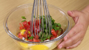 - Em uma tigela vou adicionar 3 ovos, sal, pimenta do reino, corante, orégano, 2 colheres de sopa de creme de leite, 1 tomate picado, um pouco de cheiro verde e vou misturar bem esses ingredientes.