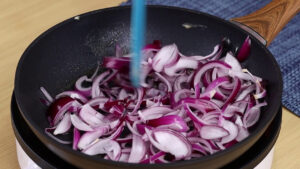 - Agora em uma frigideira em fogo médio vou adicionar 1 colher de sopa de margarina, as cebolas que cortamos e vou refogar bem.