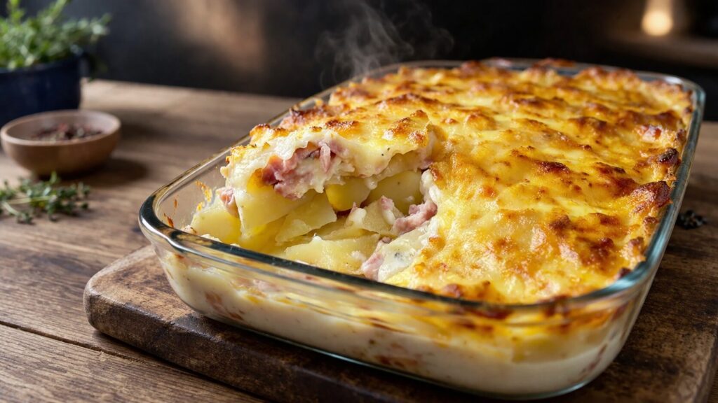 Kremamsı beşamel sos ve jambon ile hazırlanan, üzeri kızarmış ve içi yumuşacık olan lezzetli bir fırın patates yemeği. Öğle veya akşam yemeği için idealdir.